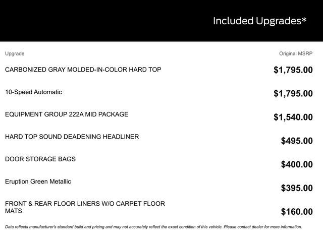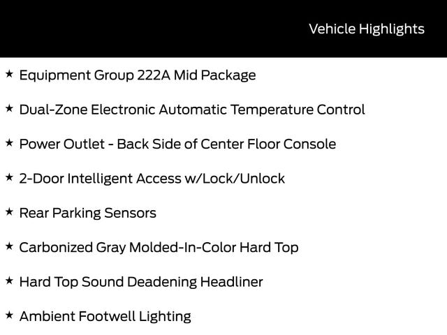 BACK UP CAMERA, BLUETOOTH, REMOTE START, CRUISE CONTROL, POWER WINDOWS, POWER LOCKS, STEERING WHEEL CONTROLS, AWD / 4WD, LANE DEPARTURE WARNING, LANE KEEP ASSIST, APPLE CARPLAY, ANDROID AUTO, FORD SYNC, AUTOMATIC EMERGENCY BRAKING, FORWARD COLLISION WARNING, REAR CROSS TRAFFIC WARNING, 2-Door Intelligent Access w/Lock/Unlock, Ambient Footwell Lighting, Carbonized Gray Molded-In-Color Hard Top, Connected Navigation, Dr & Pass Illuminated Sliding Visor Vanity Mirrors, Dual Smart Charging USB Ports, Dual-Zone Electronic Automatic Temperature Control, Equipment Group 222A Mid Package, Front Row Heated Seats, Hard Top Sound Deadening Headliner, Power Outlet - Back Side of Center Floor Console, Rear Parking Sensors, Rear-Window Defroster & Washer.