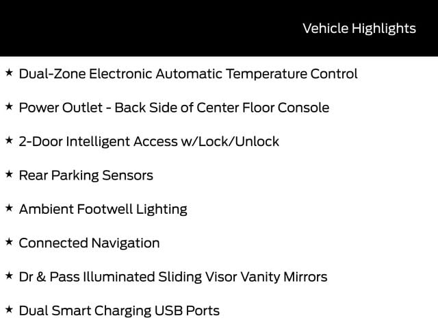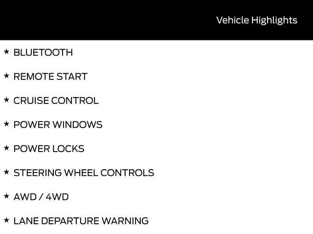 BLUETOOTH, REMOTE START, CRUISE CONTROL, POWER WINDOWS, POWER LOCKS, STEERING WHEEL CONTROLS, AWD / 4WD, LANE DEPARTURE WARNING, LANE KEEP ASSIST, APPLE CARPLAY, ANDROID AUTO, FORD SYNC, AUTOMATIC EMERGENCY BRAKING, FORWARD COLLISION WARNING, REAR CROSS TRAFFIC WARNING, 2-Door Intelligent Access w/Lock/Unlock, Ambient Footwell Lighting, Connected Navigation, Dr & Pass Illuminated Sliding Visor Vanity Mirrors, Dual Smart Charging USB Ports, Dual-Zone Electronic Automatic Temperature Control, Equipment Group 222A Mid Package, Front Row Heated Seats, Power Outlet - Back Side of Center Floor Console, Rear Parking Sensors.