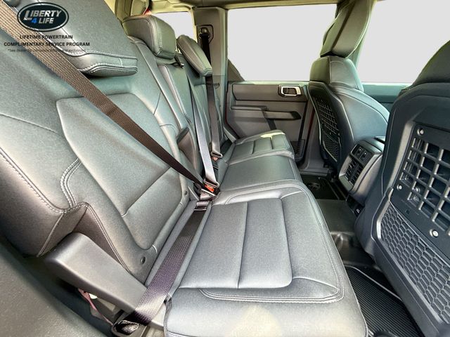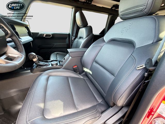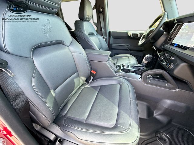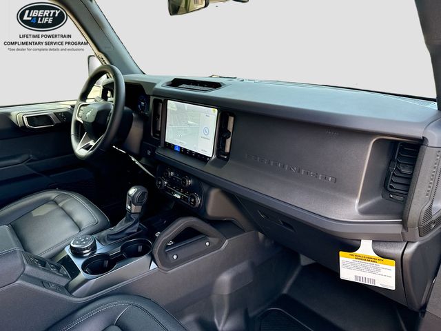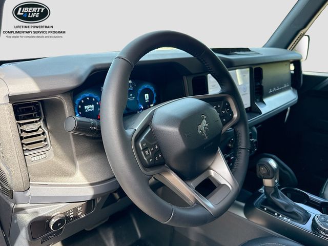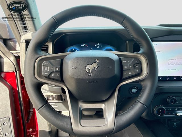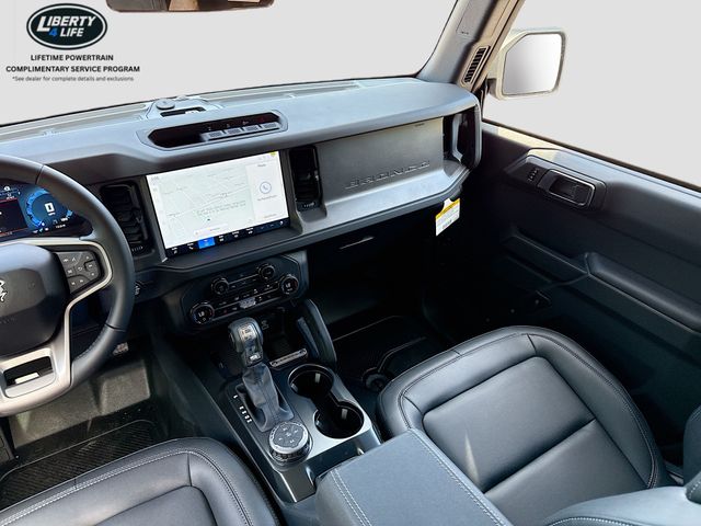 Standout features of this Bronco include the 7 speakers, SiriusXM with 360L, SYNC 4, dual-zone climate control, power outlets, traction control, and a range of safety features like airbags, ABS brakes, and electronic stability control.
