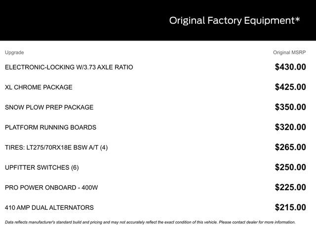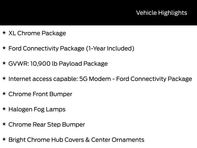 BACK UP CAMERA, BLUETOOTH, TOW PACKAGE / TRAILER HITCH, CRUISE CONTROL, POWER WINDOWS, POWER LOCKS, STEERING WHEEL CONTROLS, AWD / 4WD, LANE DEPARTURE WARNING, LANE KEEP ASSIST, FORD SYNC, AUTOMATIC EMERGENCY BRAKING, FORWARD COLLISION WARNING, REAR CROSS TRAFFIC WARNING, 4WD, Bright Chrome Hub Covers & Center Ornaments, Chrome Front Bumper, Chrome Rear Step Bumper, Ford Connectivity Package (1-Year Included), GVWR: 10,900 lb Payload Package, Halogen Fog Lamps, Internet access capable: 5G Modem - Ford Connectivity Package, Order Code 610A, Snow Plow Prep Package, XL Chrome Package.
