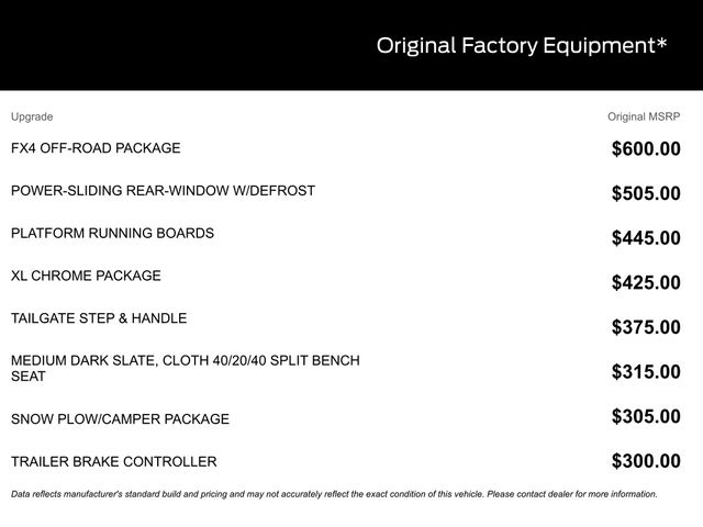 BACK UP CAMERA, BLUETOOTH, TOW PACKAGE / TRAILER HITCH, REMOTE START, CRUISE CONTROL, POWER WINDOWS, POWER LOCKS, STEERING WHEEL CONTROLS, AWD / 4WD, LANE DEPARTURE WARNING, LANE KEEP ASSIST, APPLE CARPLAY, ANDROID AUTO, FORD SYNC, AUTOMATIC EMERGENCY BRAKING, FORWARD COLLISION WARNING, REAR CROSS TRAFFIC WARNING, 4WD, 250 Amp Alternator, 410 Amp Dual Alternators, Chrome Front Bumper, Chrome Rear Step Bumper, Ford Connectivity Package (1-Year Included), FX4 Off-Road Package, Halogen Fog Lamps, Hill Descent Control, Internet access capable: 5G Modem - Ford Connectivity Package, Off-Road Specifically Tuned Shock Absorbers, Order Code 670A, Rapid-Heat Supplemental Cab Heater, Snow Plow Prep Package, Snow Plow/Camper Package, Unique FX4 Off-Road Box Decal, XL Chrome Package.